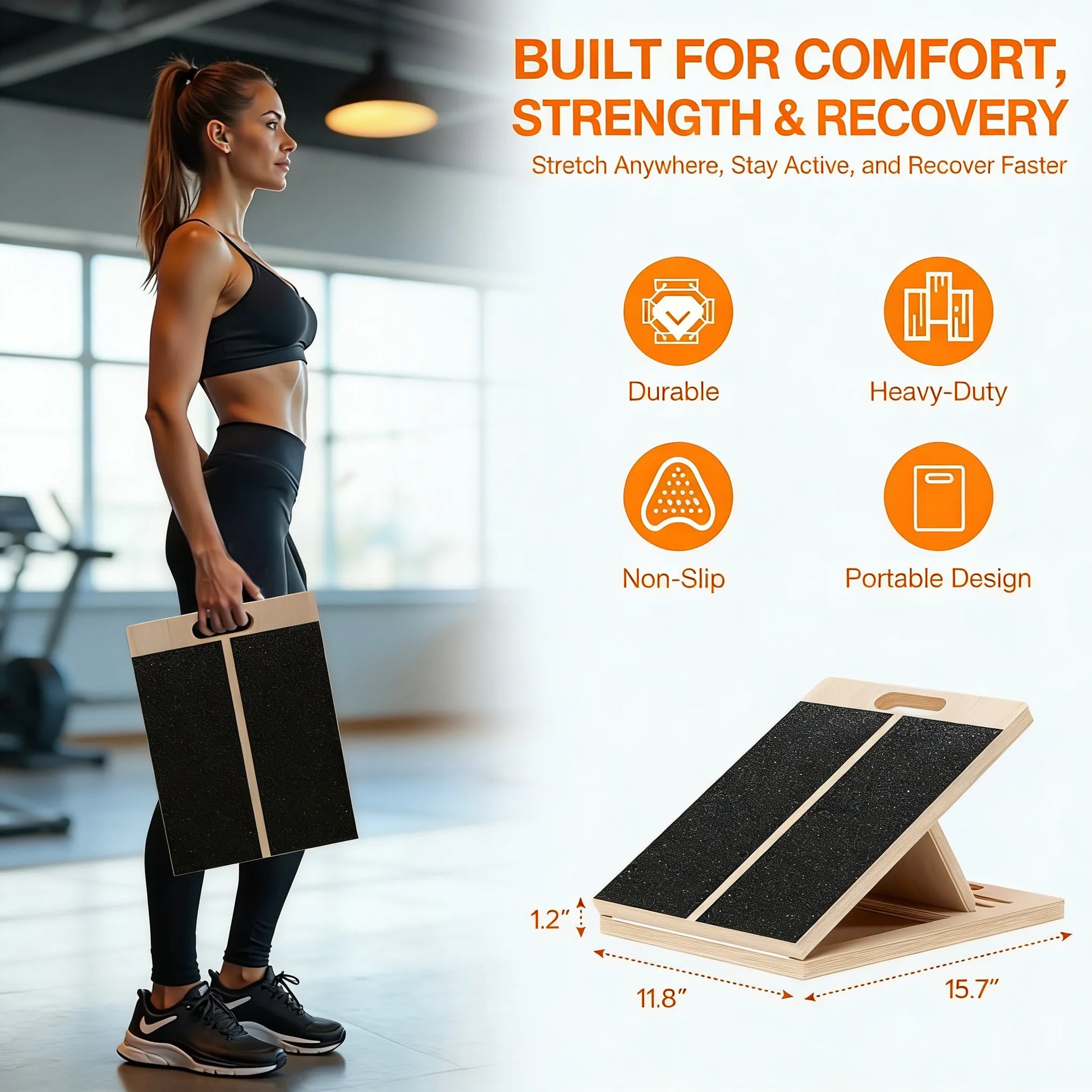 👍 Premium Hardwood Construction: Made from high-density wood, this wedge board is built for exceptional strength and stability. With a 500 lbs weight capacity, its pressed wood surface and anti-slip design ensure safety during each exercise. Perfect for squats, heel stretches, and foot positioning, this board helps improve strength, balance, and flexibility.